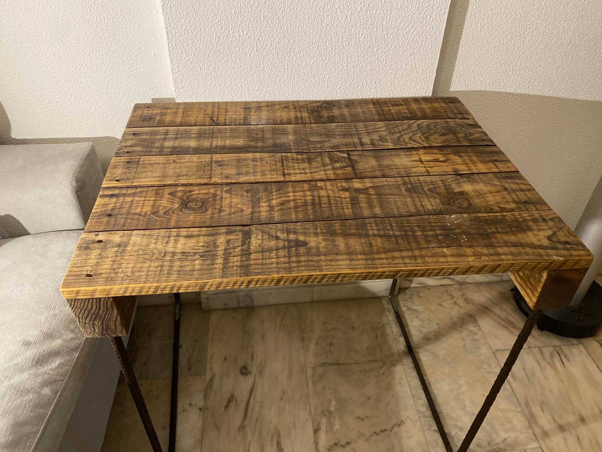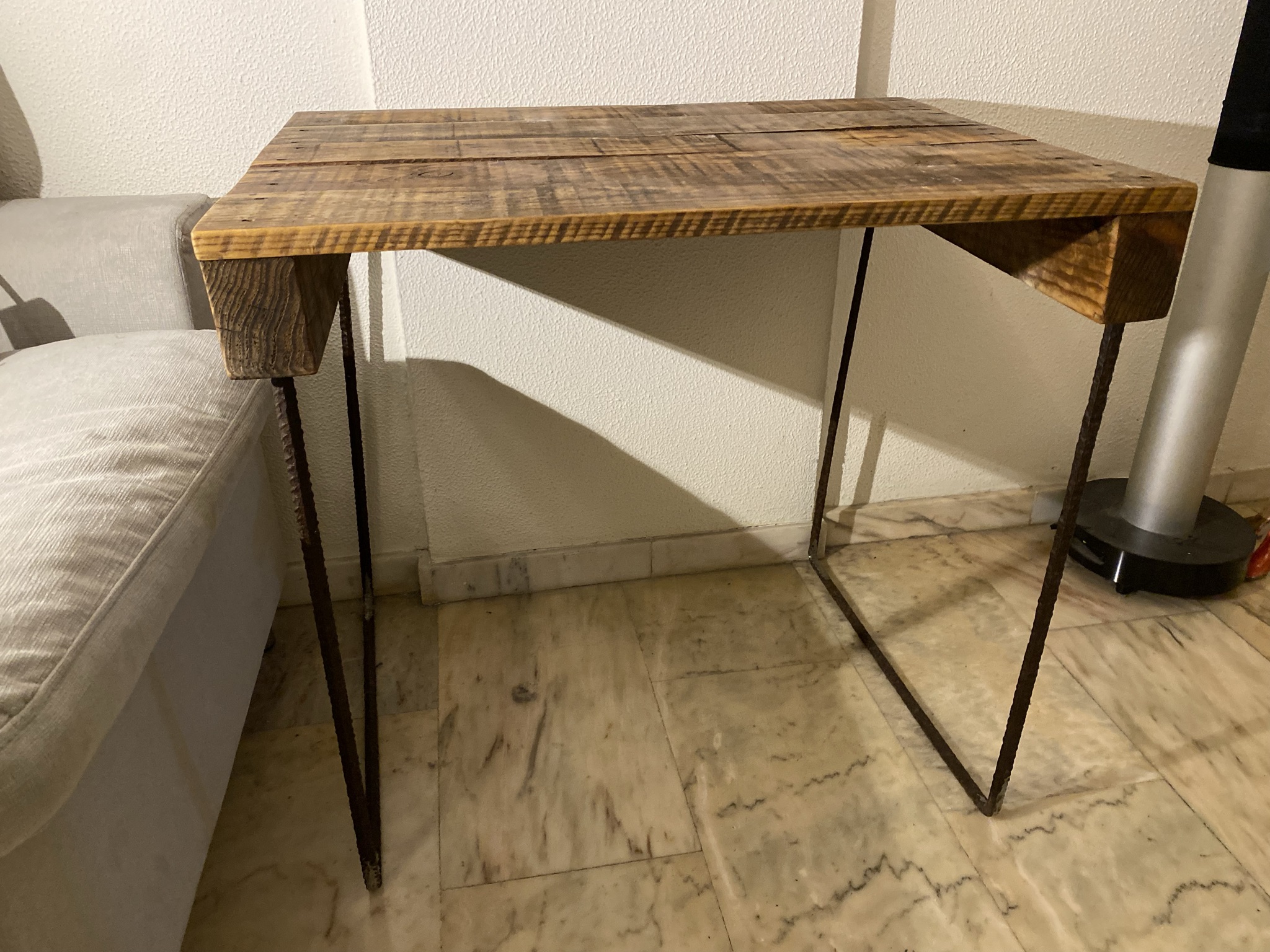 Mesa artesanal fabricada con madera reciclada de palets y patas metálicas estilo industrial. Perfecta como mesa auxiliar, escritorio pequeño o mesa decorativa, combinando sostenibilidad, diseño y funcionalidad.